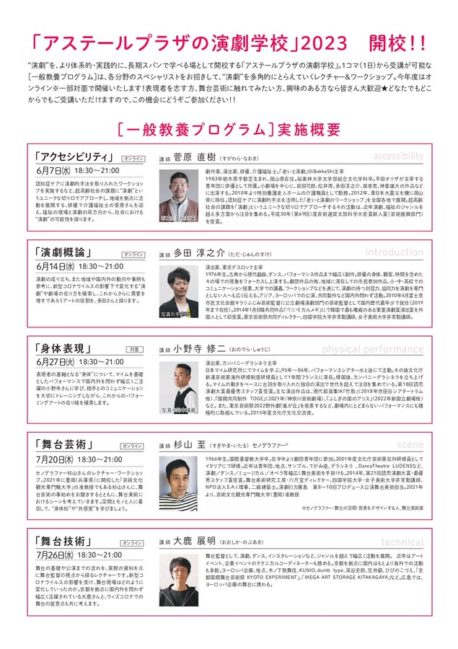 ZoomDetails アステールプラザの演劇学校[一般教養プログラム]「身体表現」2023年6月27日(火) これまで, ワークショップBy カンパニーデラシネラPosted: 2023.4.24Last updated: 2023.6.28 23:42