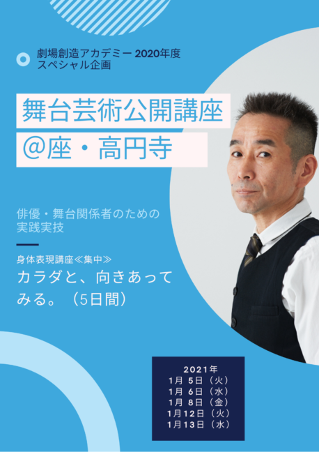 ZoomDetails 俳優・舞台関係者のための実践実技 第2回 身体表現講座≪集中≫2021年1月5日(火)〜1月13日(水) これまで, ワークショップBy カンパニーデラシネラPosted: 2021.1.13Last updated: 2021.1.28 23:50