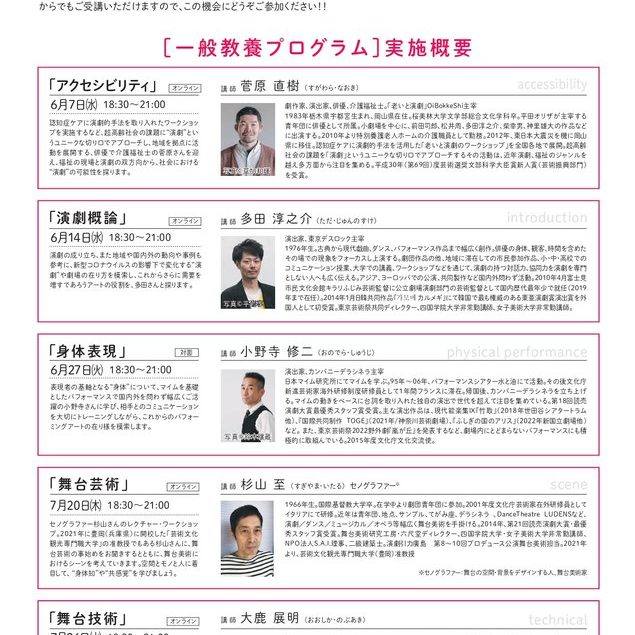 マイムをベースにした身体訓練や、喋らない時の身体のありよう、そしてただ立ってみる、ただ歩いてみる、ただ喋ってみます。その他、何が格好良くて何が格好悪いのか、何が許せて何が許せないのか。身体を動かすことに苦手意識のある方、その苦手がどこからくるか探ってみませんか。