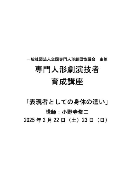 ZoomDetails 全人協のプロ向け人形劇講座2025年2月22日(土)〜2月23日(日) これまで, ワークショップBy カンパニーデラシネラPosted: 2025.1.19Last updated: 2025.2.23 18:59